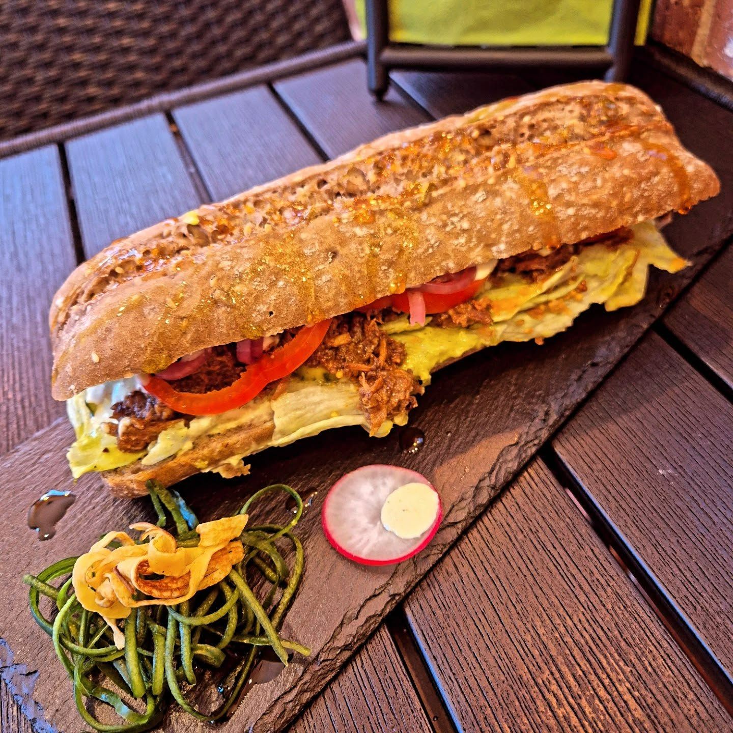 pieczywo, mayo-musztarda-miód, sałaty, mięso, ogórek piklowany, papryka świeża, cebula piklowana, sos autorski, cebulka prażona -
