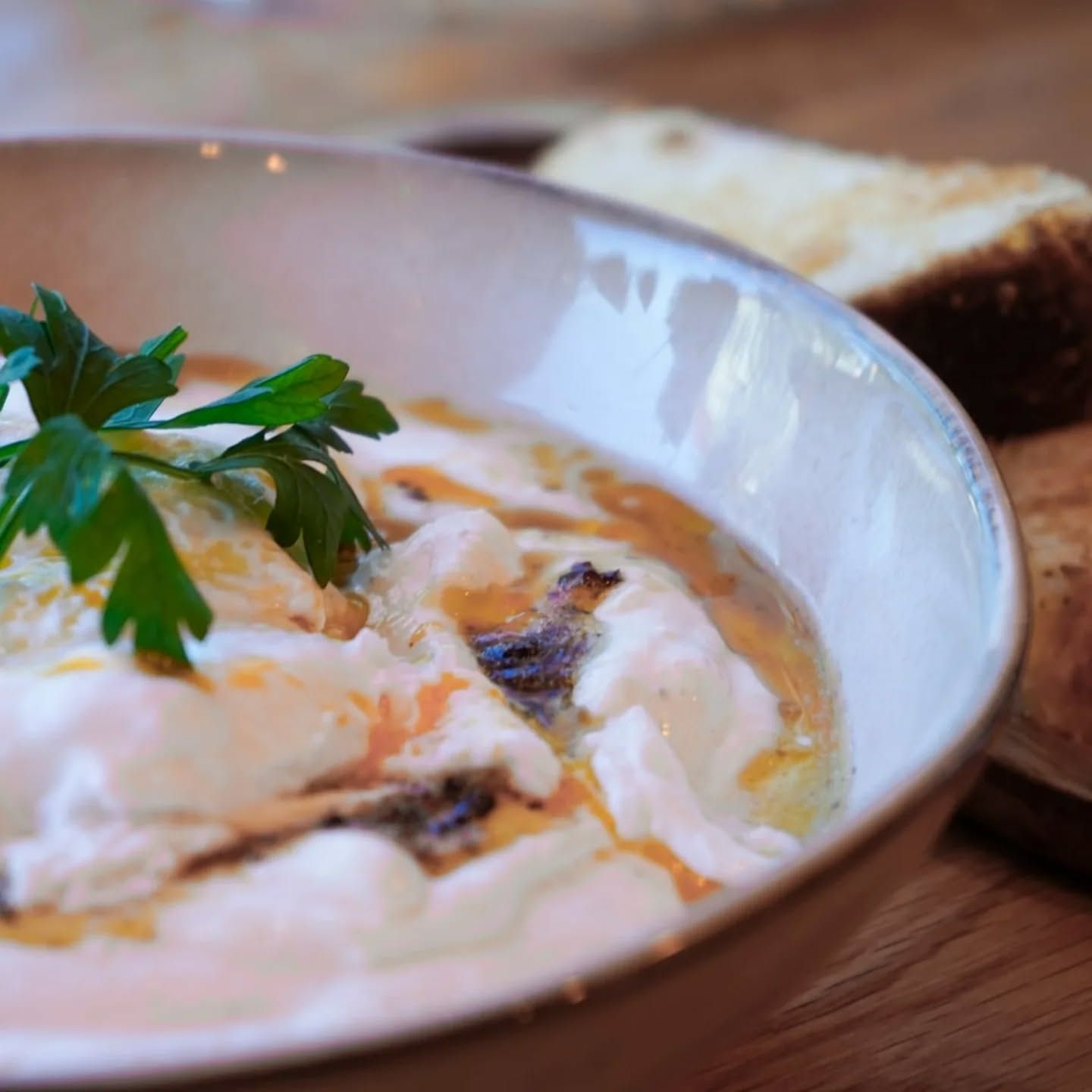 jaja, jogurt, masło palone z chili, kumin, czosnek, natka pietruszki, oliwa, chałka, masło -